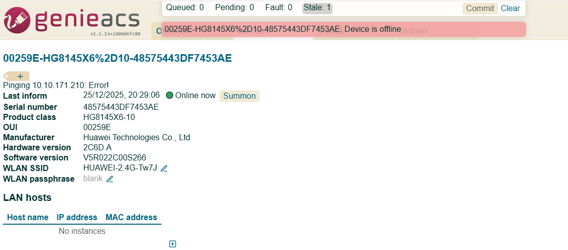 Hi guys, sorry for asking for help, I’m a complete beginner with Genie ACS. I’m trying to connect a Huawei ONT from a remote network that isn’t mine. I set up port forwarding on my Mikrotik router with a public IP address, which connects via LAN to the Genie ACS server. On the ONT, I entered the Mikrotik’s public IP address plus the external port I assigned. The ONT reports to the server without problems, but I get a ping error because it’s trying to ping the ONT’s local IP address. Because of this, I can’t modify anything on the ONT; it keeps showing an error message saying the ONT is offline and can’t be pinged, even though the ONT is visible. It might be something stupid, but if anyone knows how to fix this, please let me know. Thanks, guys.